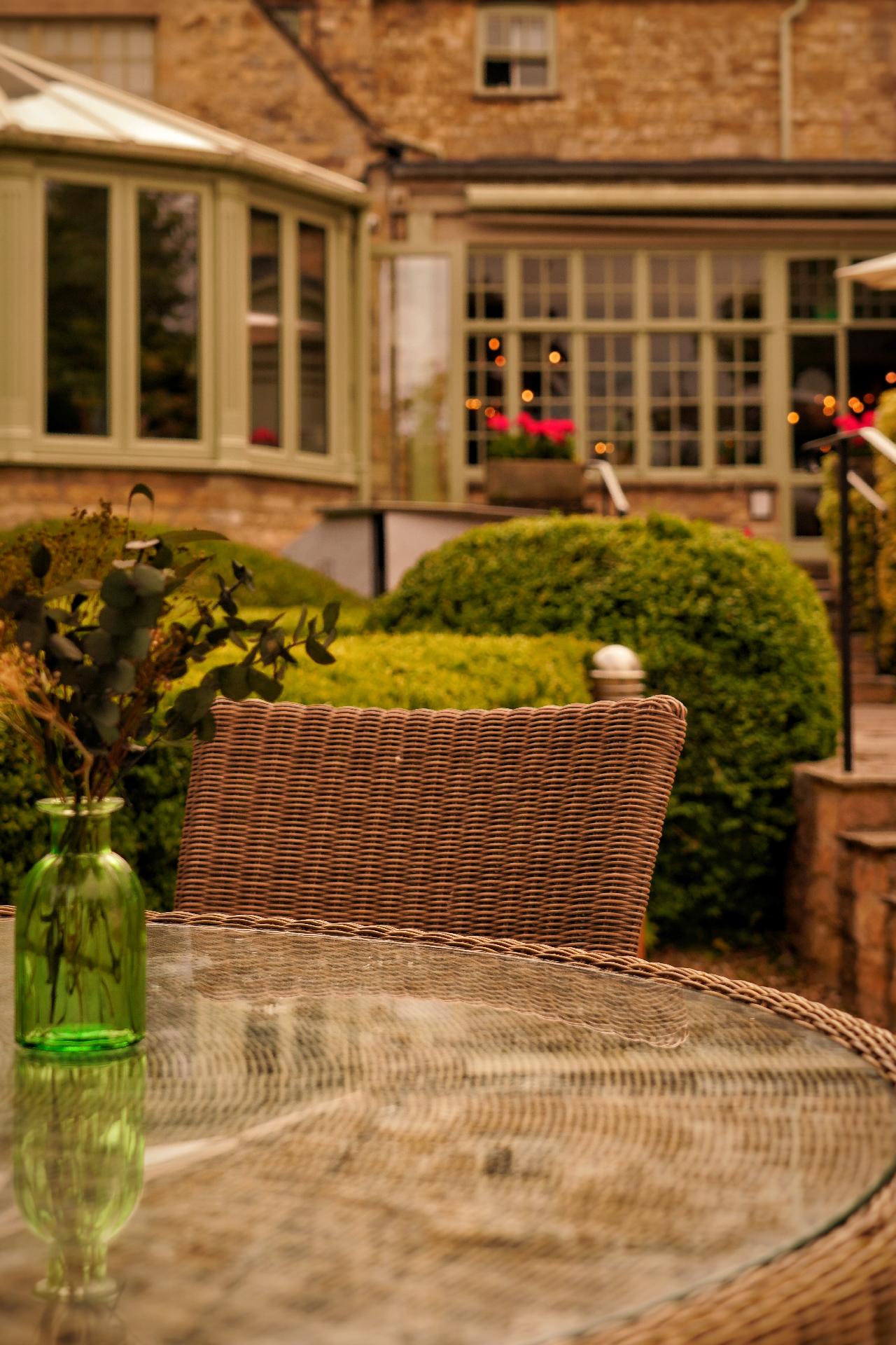 Tucked away behind the hotel, The Bay Tree's private walled garden is a peaceful escape from bustling Burford. The stone patio terrace, adorned with rattan furniture, leads down elegant stone steps to a charming Summer House with French doors overlooking the restaurant and conservatory. Guests in the Garden Bedrooms can enjoy stunning views of the manicured lawn and walled gardens from their Juliette balconies, making it an ideal spot for relaxation or intimate gatherings.
