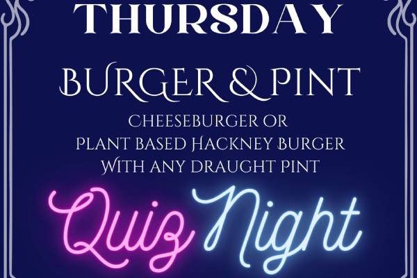 Enjoy a classic Burger and Chips and your favourite pint for £18. Joining us for dinner? Why not stay for a bit longer and join in on our weekly Quiz Night?